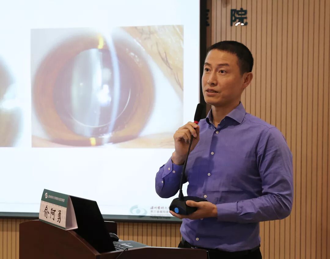 温州总院俞阿勇教授带来了“ICL植入——从无到有,从有到无”的主题授课。俞教授介绍了ICL植入手术经历了人工晶状体从没有中央孔到有中央孔,术式从有黏弹剂到没有黏弹剂的过程。中央孔的出现,为绝大部分ICL植入患者避免了虹膜周边切除的操作,保证了虹膜的完整性。而无黏弹剂手术则大大减轻了术后早期高眼压、晶状体混浊可能、耗材耗时等弊端。最后,俞教授还简要介绍了全黏弹剂ICL植入、半黏弹剂ICL植入和无黏弹剂ICL植入的手术步骤,并为大家展示了其专利的无黏弹剂ICL手术视频。