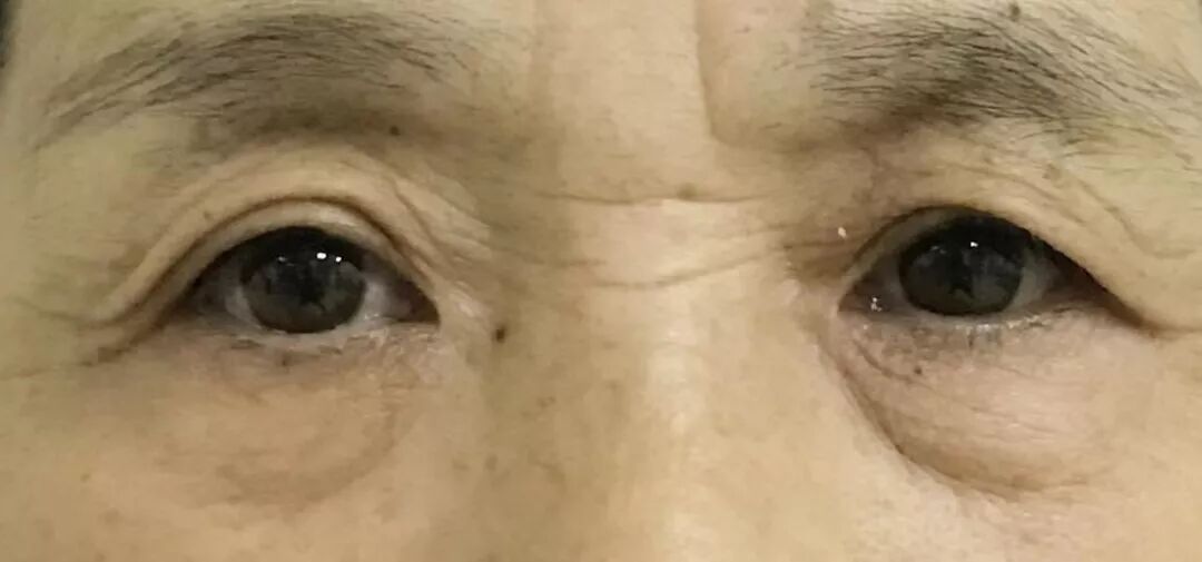 3、松弛的皮肤在上睑堆积,导致上睑呈重力性下垂,遮盖原来的双眼皮同时眼轮匝肌变薄,眶隔松弛,眶内脂肪膨出,上睑显现臃肿。