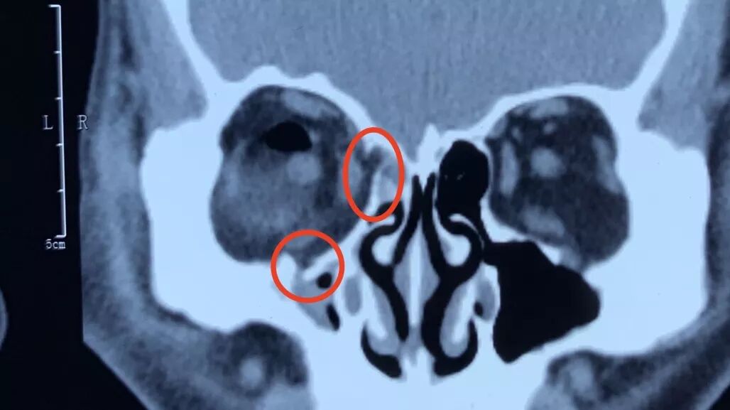 上图可见眼眶内侧壁和下壁骨折,眼眶内容物进入鼻腔