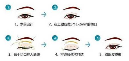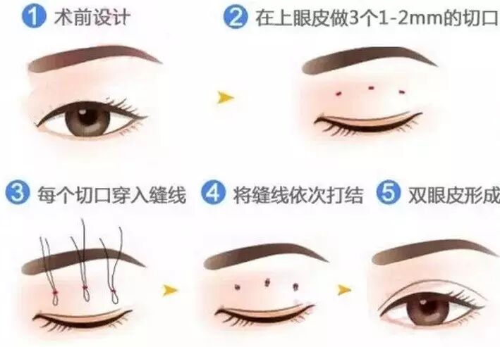 三点定位双眼皮,也称为韩式三点双眼皮。三点双眼皮手术的伤口则是介于缝合式与开放式双眼皮手术之间,就是在眼皮上制作三个长度仅有1—2毫米的不连续的微小伤口,属于半开放式双眼皮手术方法。由这三个不连续的小切口进入把双眼皮固定,还可以同时抽出眼泡脂肪。