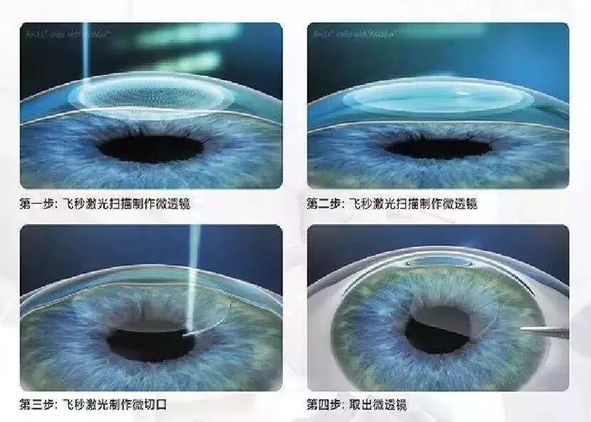 全飞秒:飞秒激光扫描角膜,切出一个小透镜(相当于近视眼镜),然后角膜上做一个小切口,从小切口里拿出切好的透镜(相当于做了一个口袋,从口袋里取出透镜)。