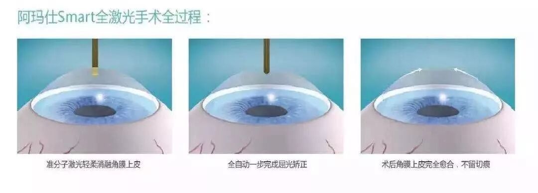 Smart:智能脉冲技术辅助进行的Trans-PRK。它的原理简单来说,就是切角膜的上皮和浅基质,上皮会再生,基质不能再生。在基质上切出需要的“眼镜镜片”,之后上皮再生长回来。