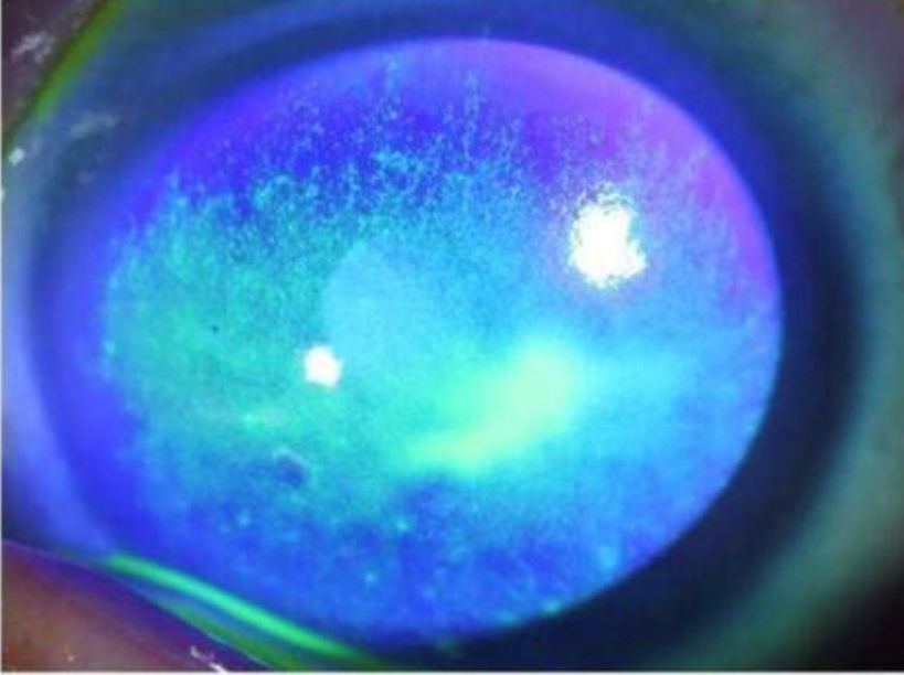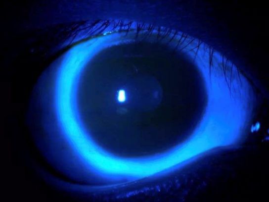 接诊的是眼底病专科副主任孙长文副主任医师,检查后发现林先生双眼角膜弥漫点状上皮脱落(如同湿润的河床干涩裂开),追问病史,原来林先生最近每天使用眼贴敷眼,考虑是眼贴药物刺激所致。