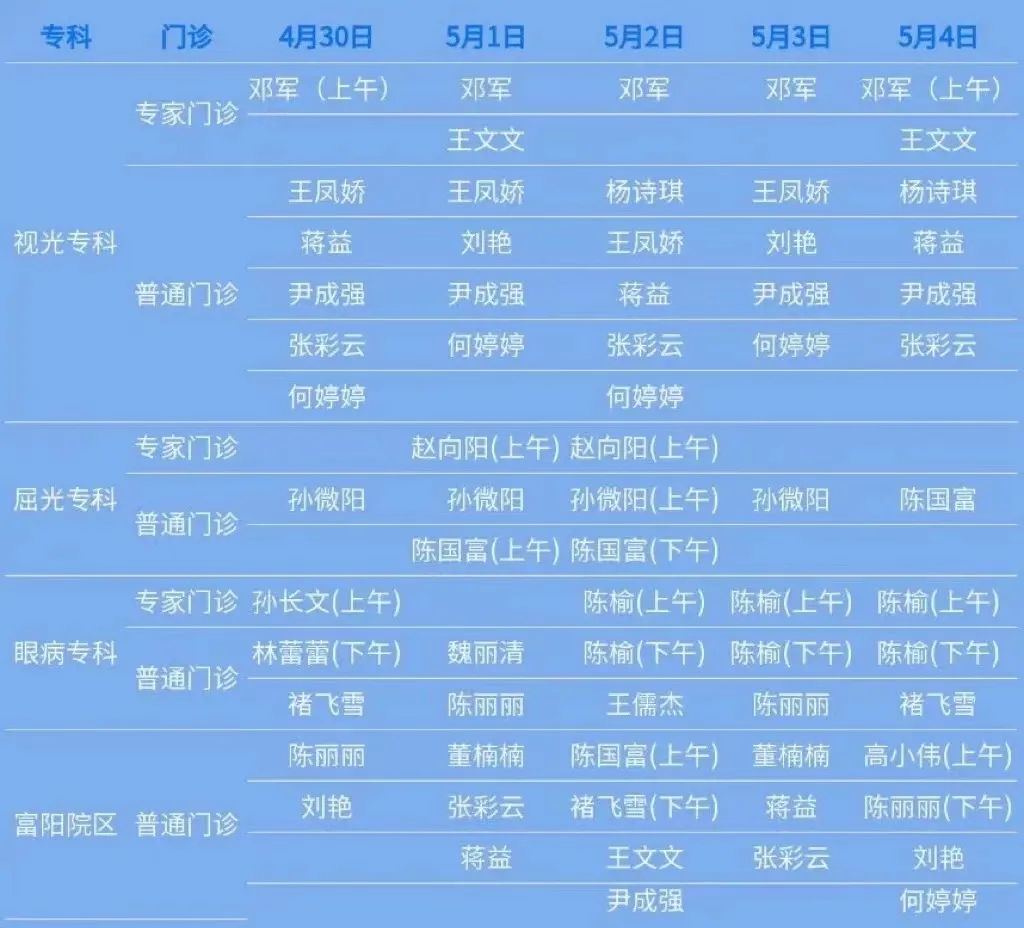 劳动节假期期间(4月30日-5月4日),浙江省眼科医院之江院区和富阳院区门诊照常。